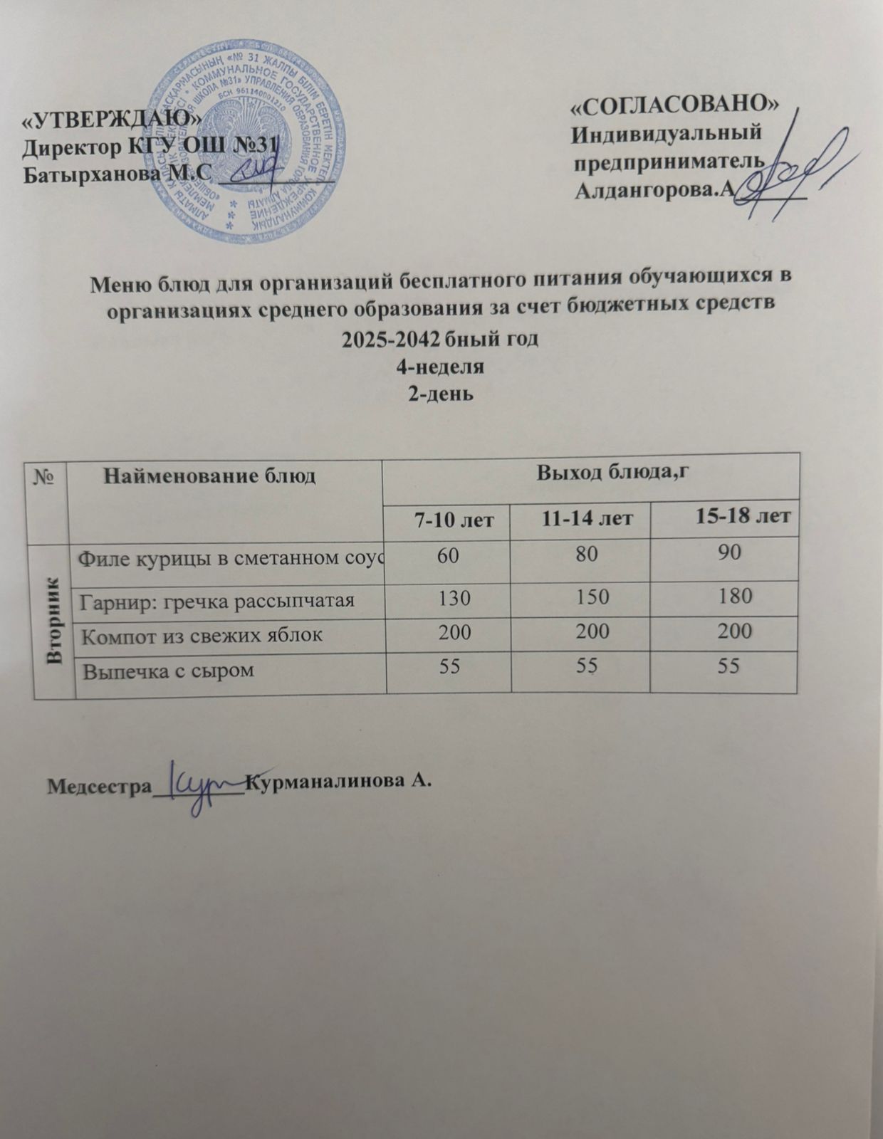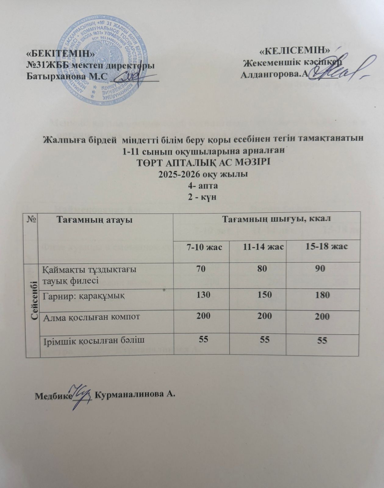 » Ас мәзірі 4 апта 2 күн. Меню 4 неделя 2 день