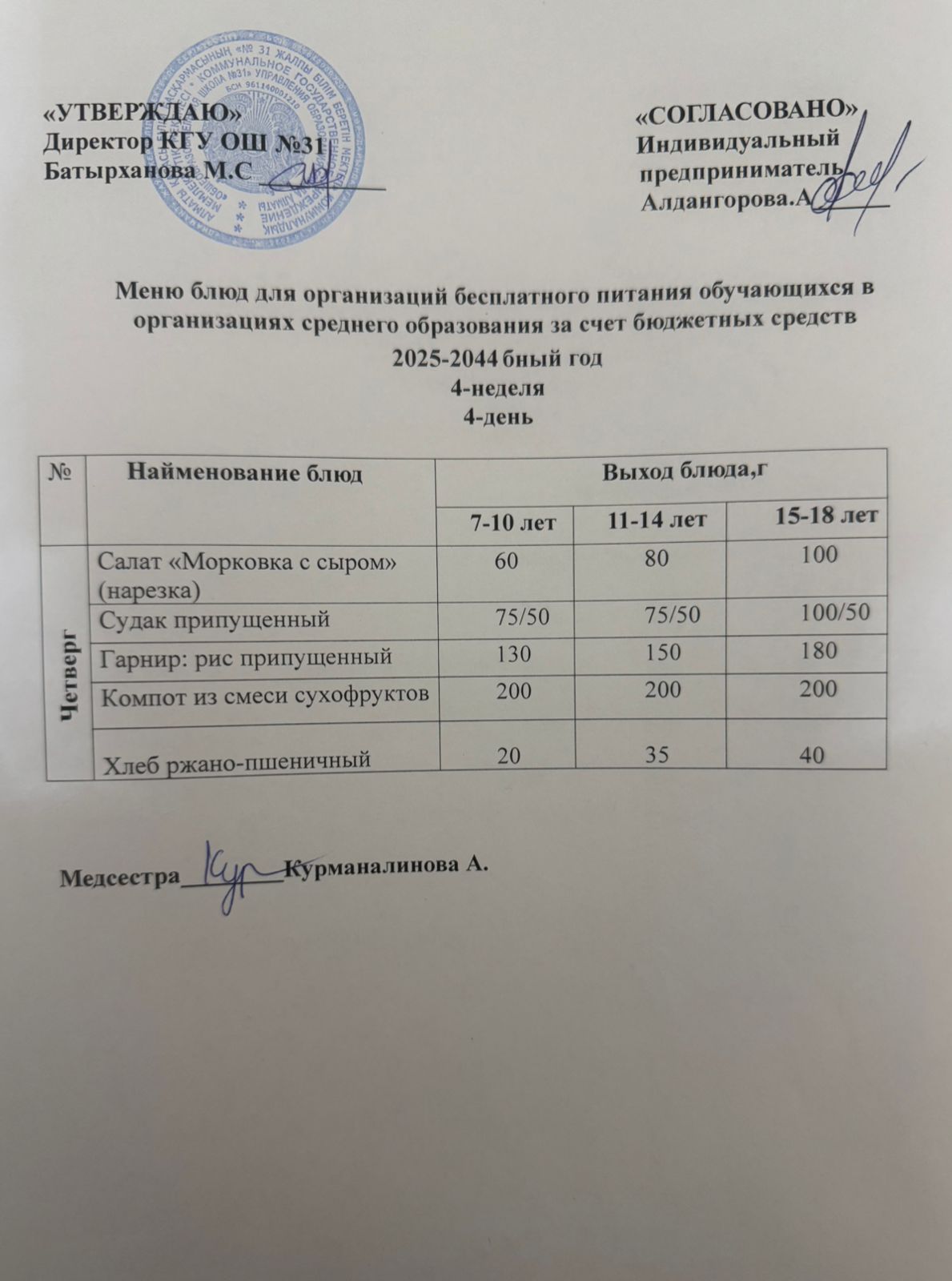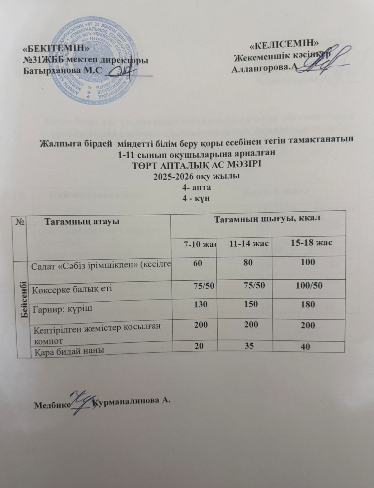 Ас мәзірі 4 апта 5 күн. Меню 4 неделя 5 день.