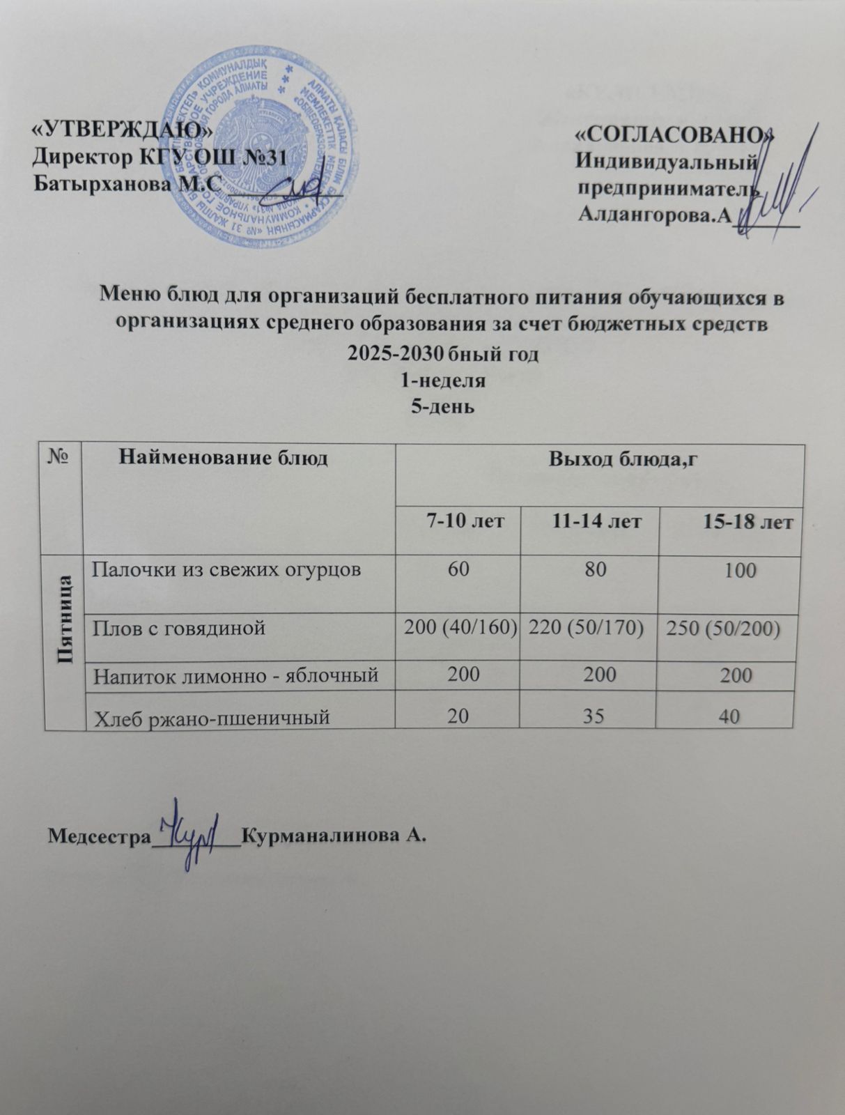 Ас мәзірі 1 апта 5 күн. Меню 1 неделя 5 день