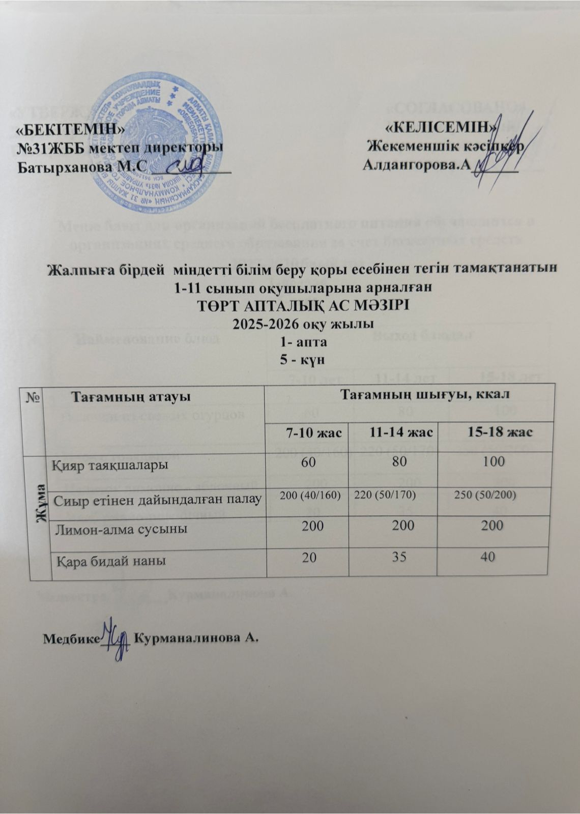 Ас мәзірі 4 апта 5 күн. Меню 4 неделя 5 день.