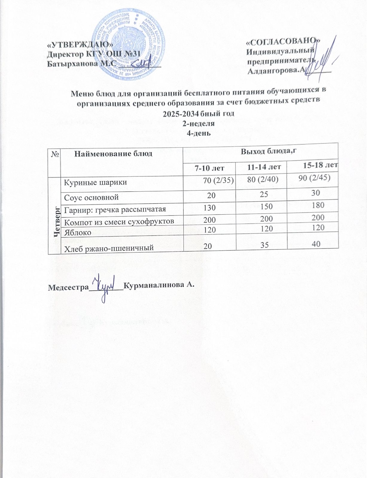 Ас мәзірі 2 апта 4 күн. Меню 2 неделя 4 день