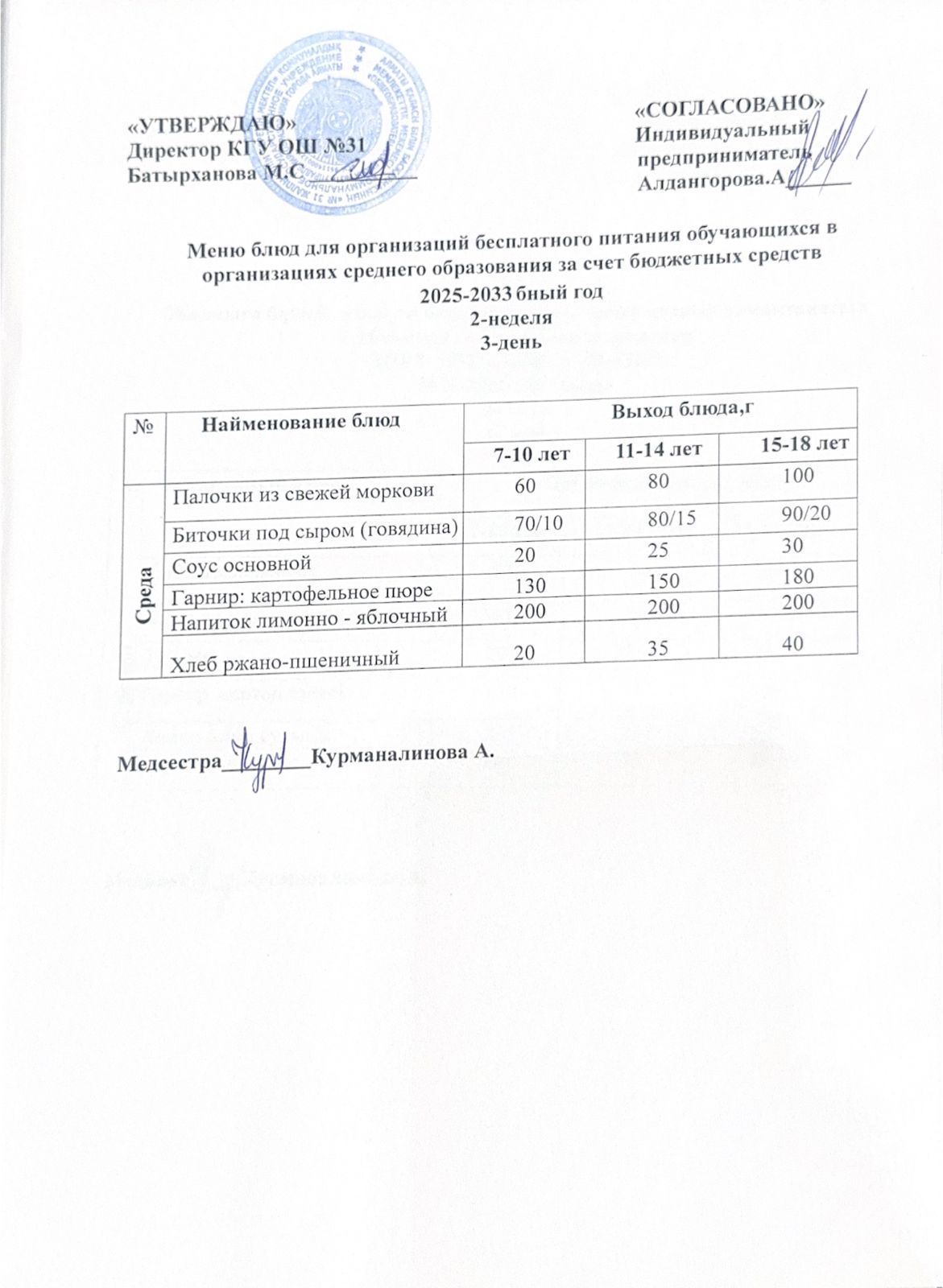 Ас мәзірі 2 апта 3 күн. Меню 2 неделя 3 день.
