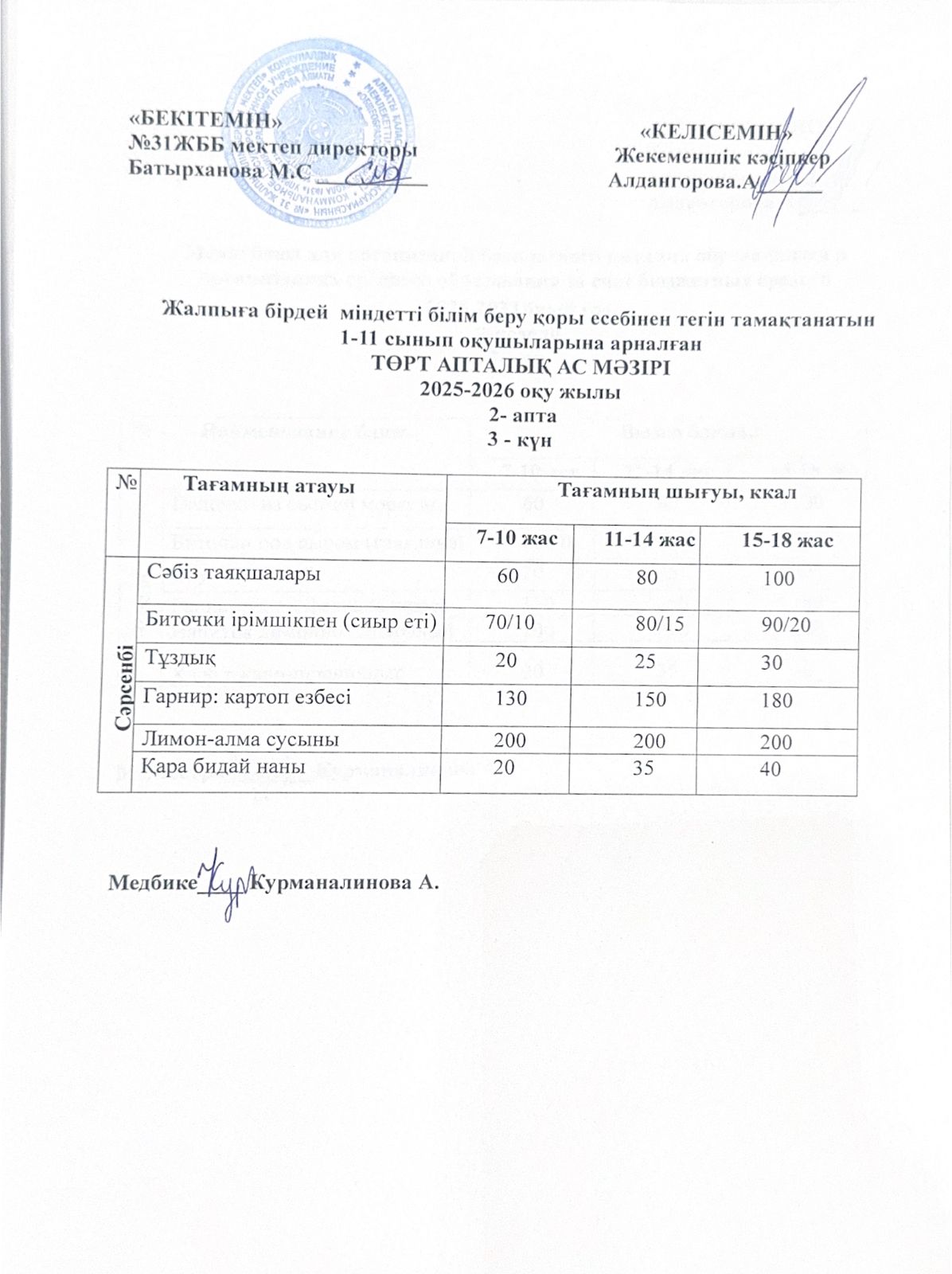 Ас мәзірі 2 апта 3 күн. Меню 2 неделя 3 день.