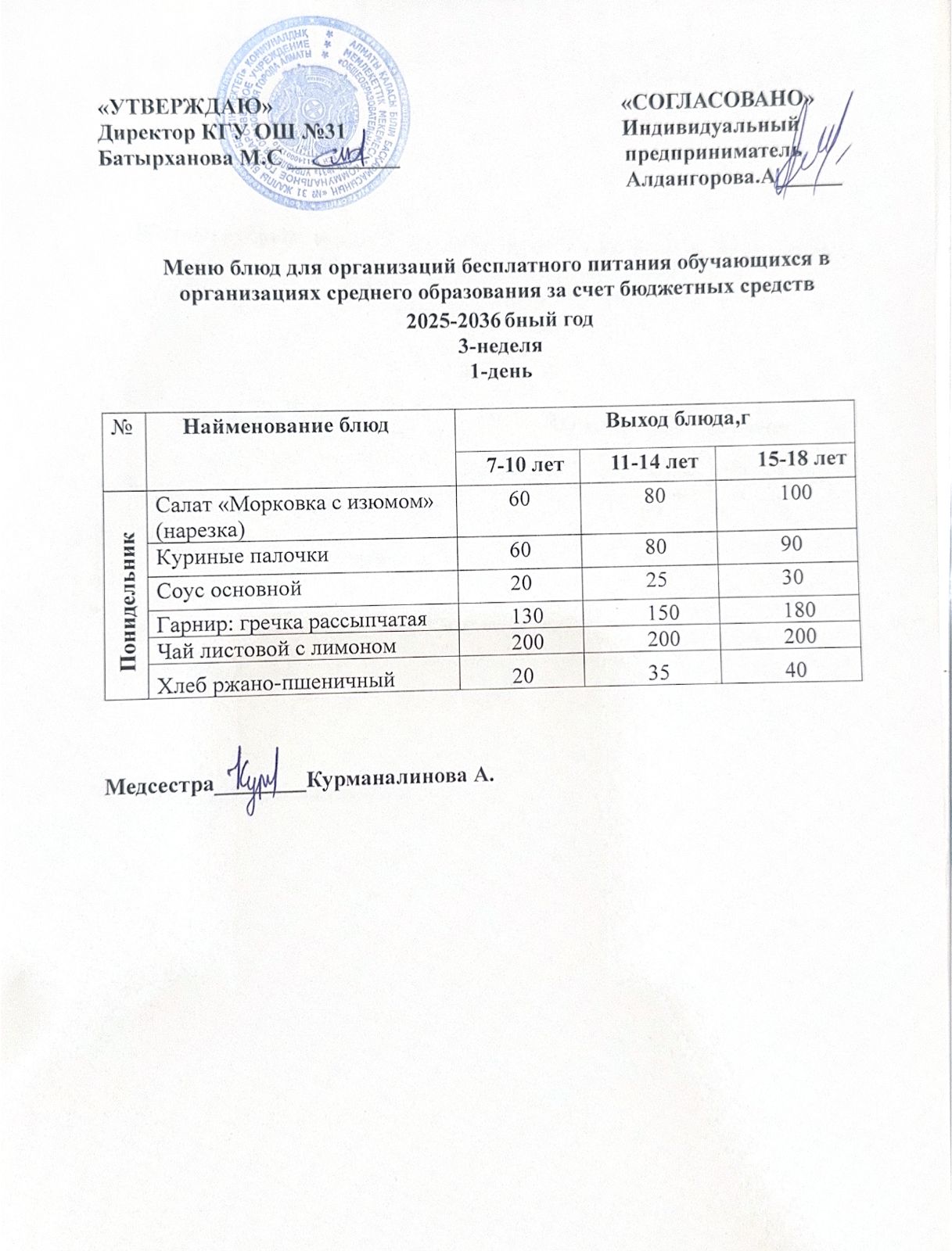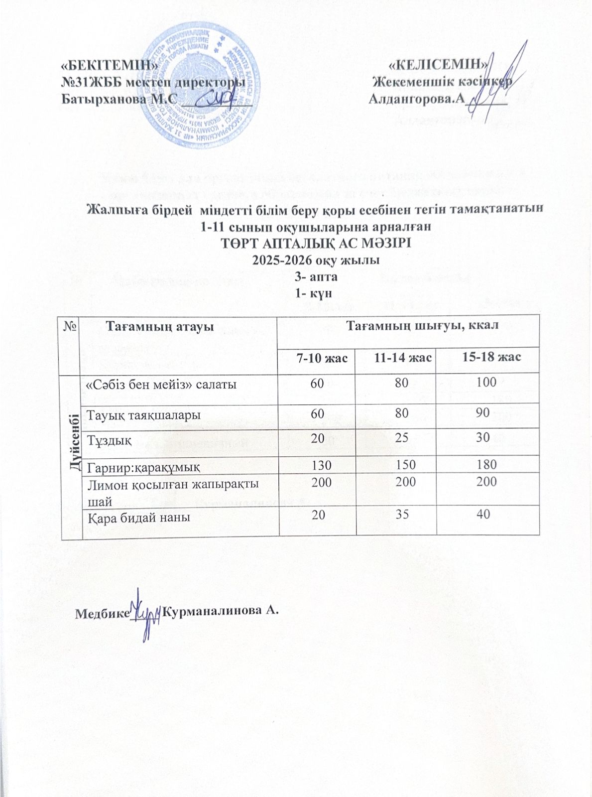 Ас мәзірі 3 апта 1 күн. Меню 3 неделя 1 день.