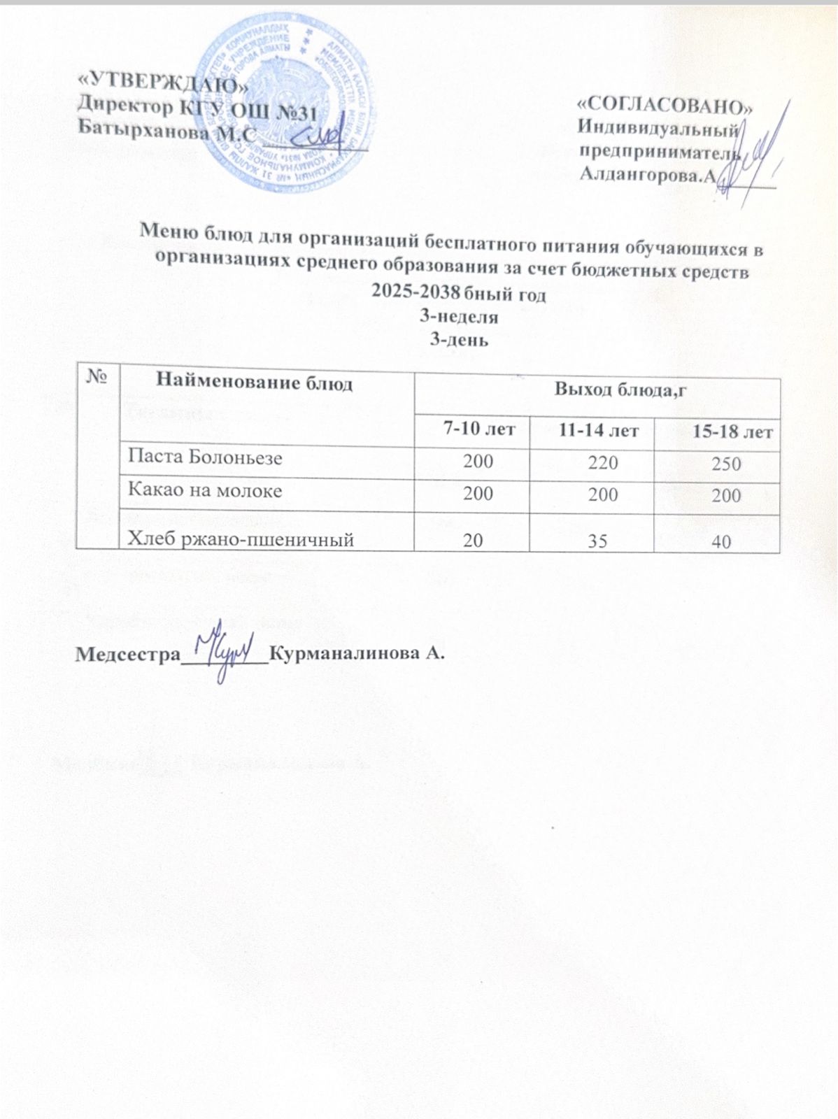 Ас мәзірі 4 апта 3 күн. Меню 4 неделя 3 день.