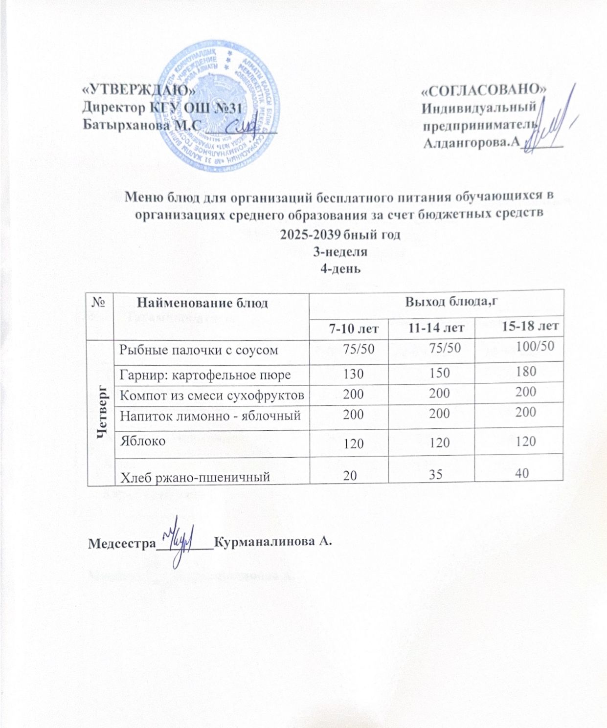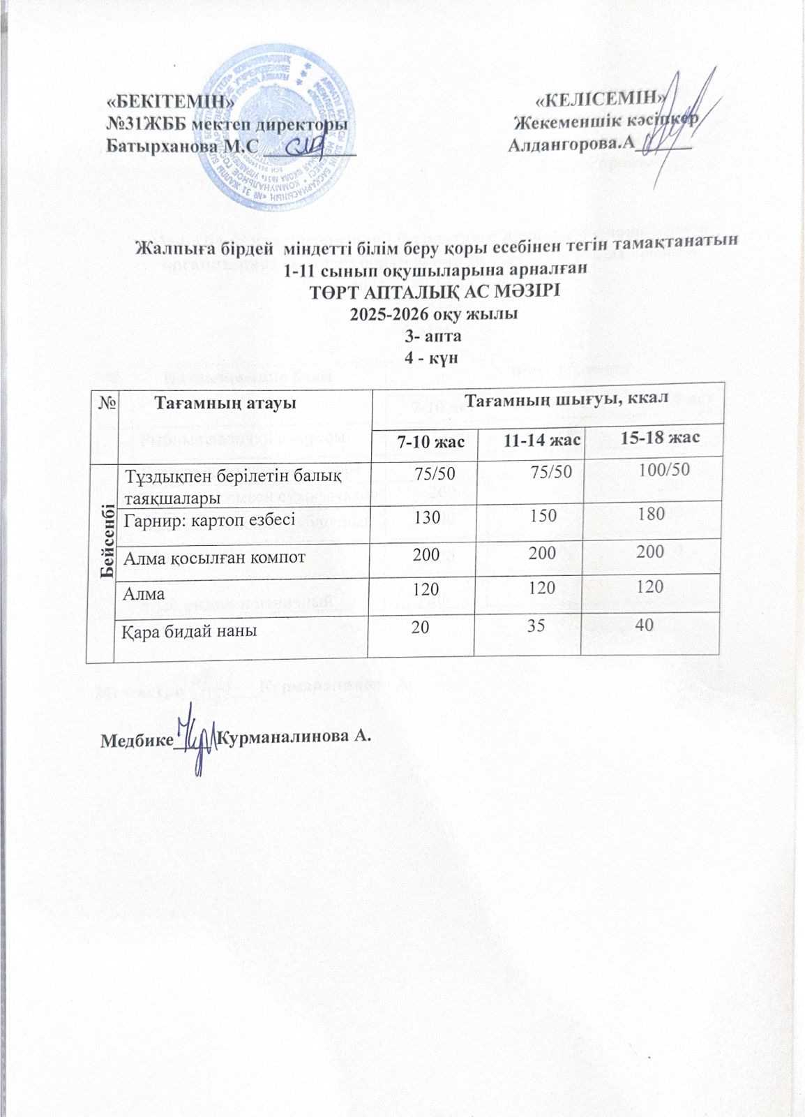 Ас мәзірі 4 апта 3 күн. Меню 4 неделя 3 день.