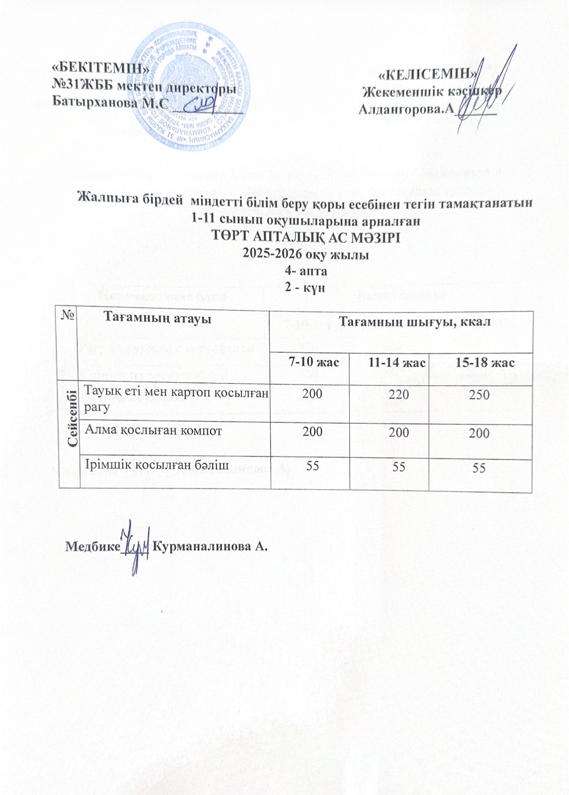 » Ас мәзірі 4 апта 2 күн. Меню 4 неделя 2 день