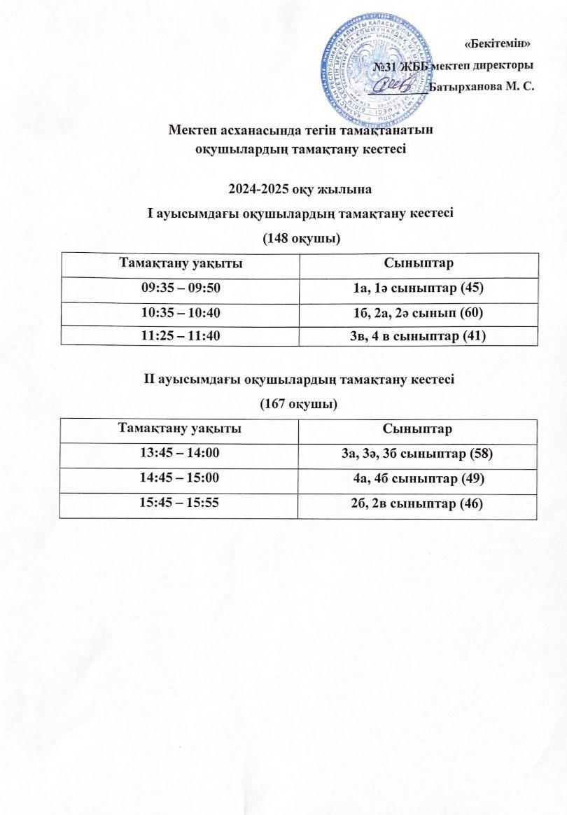 » Оқушылардың тамақтану кестесі. / График питания учащихся.