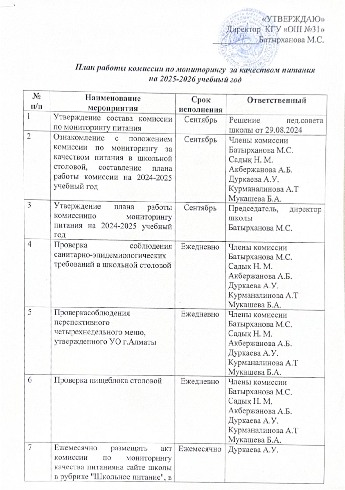 02 қыркүйек 2025 0 1 2 3 4 5 Тамақтануды ұйымдастыру бойынша жұмыс жоспары/ Утвержденный план работы по организации питания - 2025г.