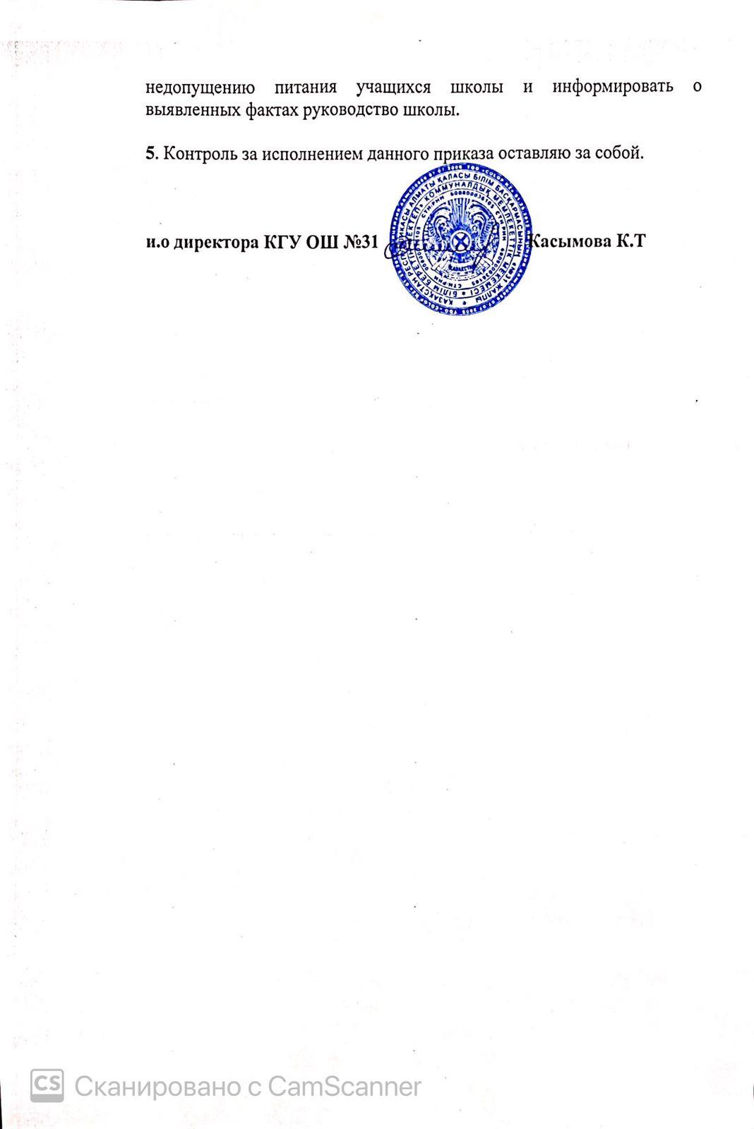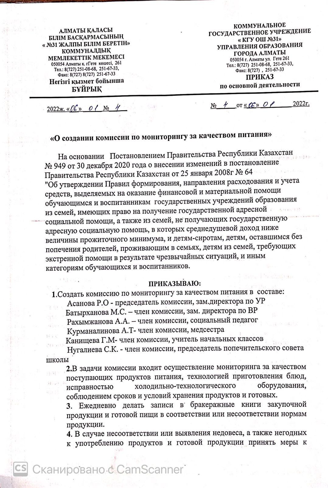 31 қаңтар 2022 0 1 2 3 4 5 Тамақтану сапасын бақылау жөніндегі комиссия құру туралы бұйрық. Приказ о создании коммиссии по мониторингу за качеством питания