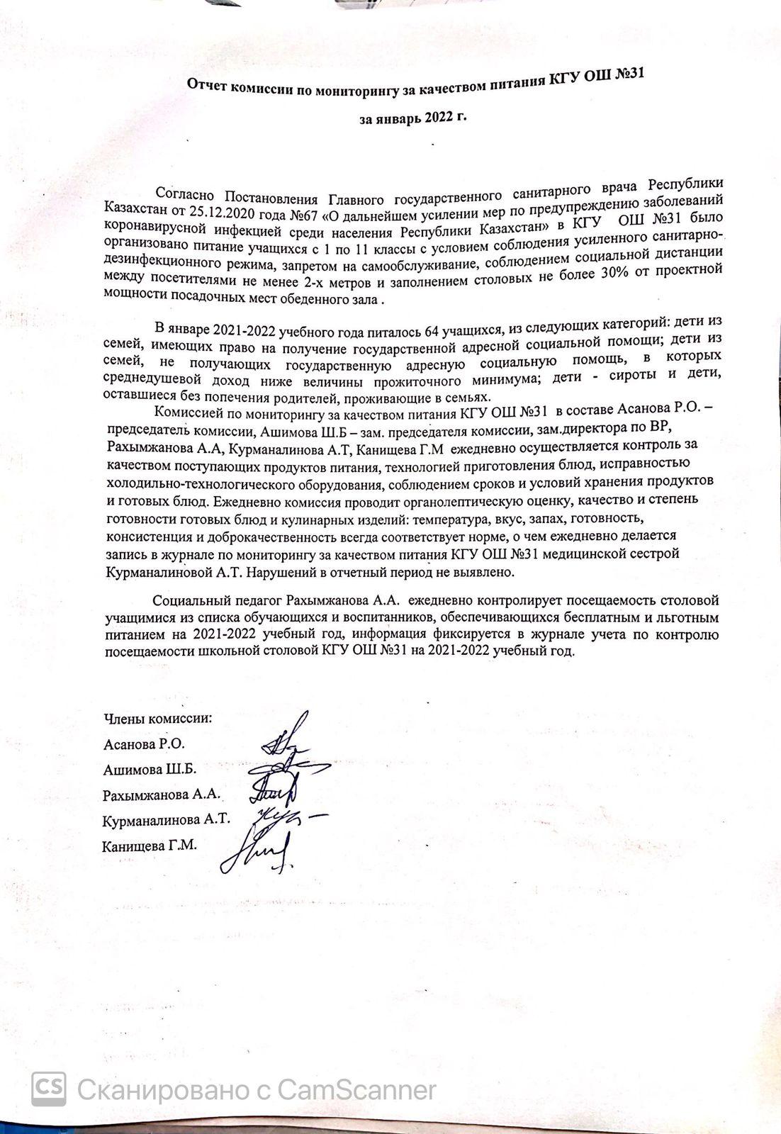 31 қаңтар 2022 0 1 2 3 4 5 Тамақтану сапасын бақылау жөніндегі комиссияның есебі. Отчет комисси по мониторингу за качеством питания