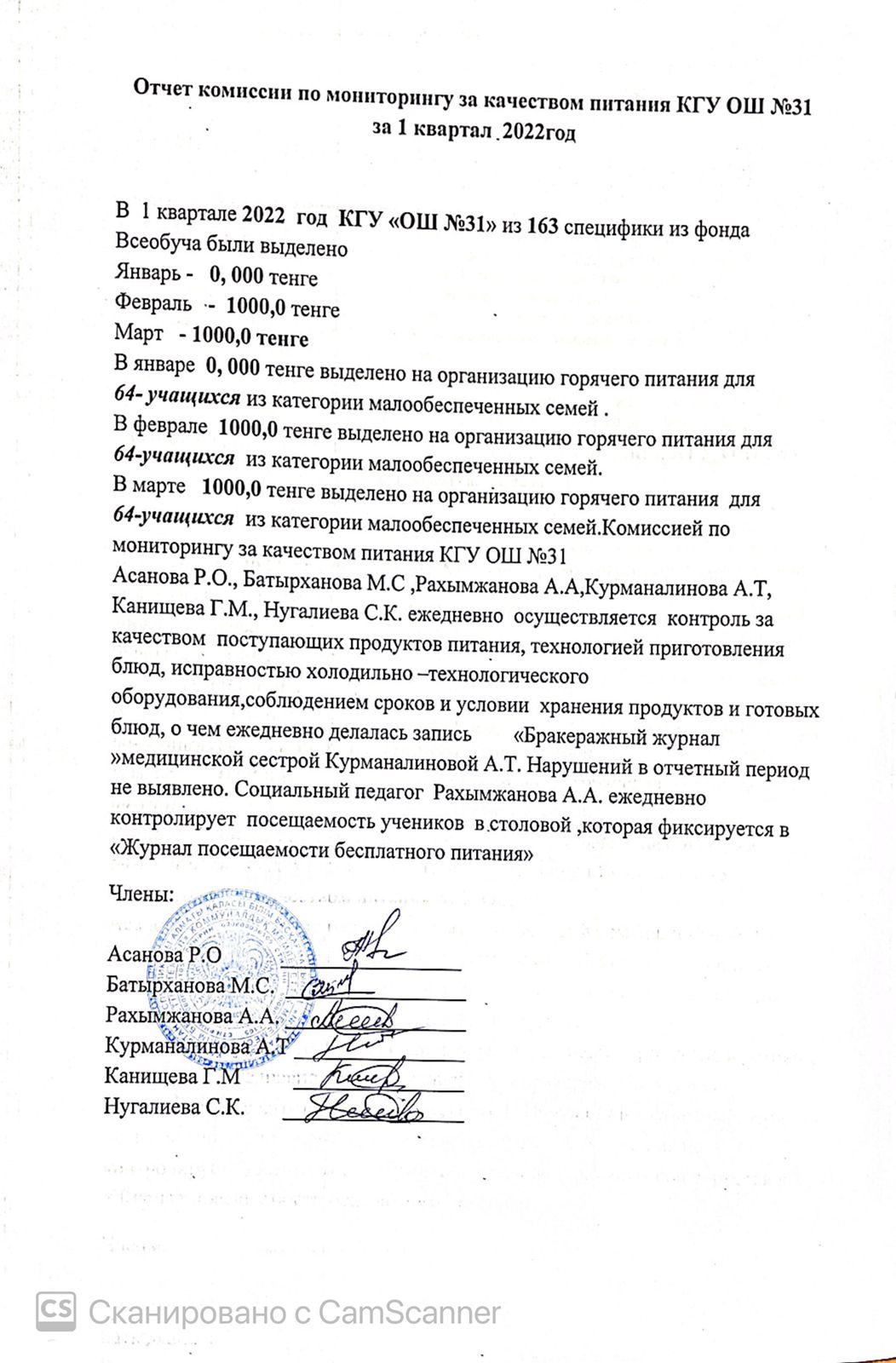 2021-2022 оқу жылының 1 тоқсанындағы тамақтану сапасын бақылау комиссиясының есебі. Отчет комисси по мониторингу за качеством питания за 1 квартал 2021-2022 уч.год
