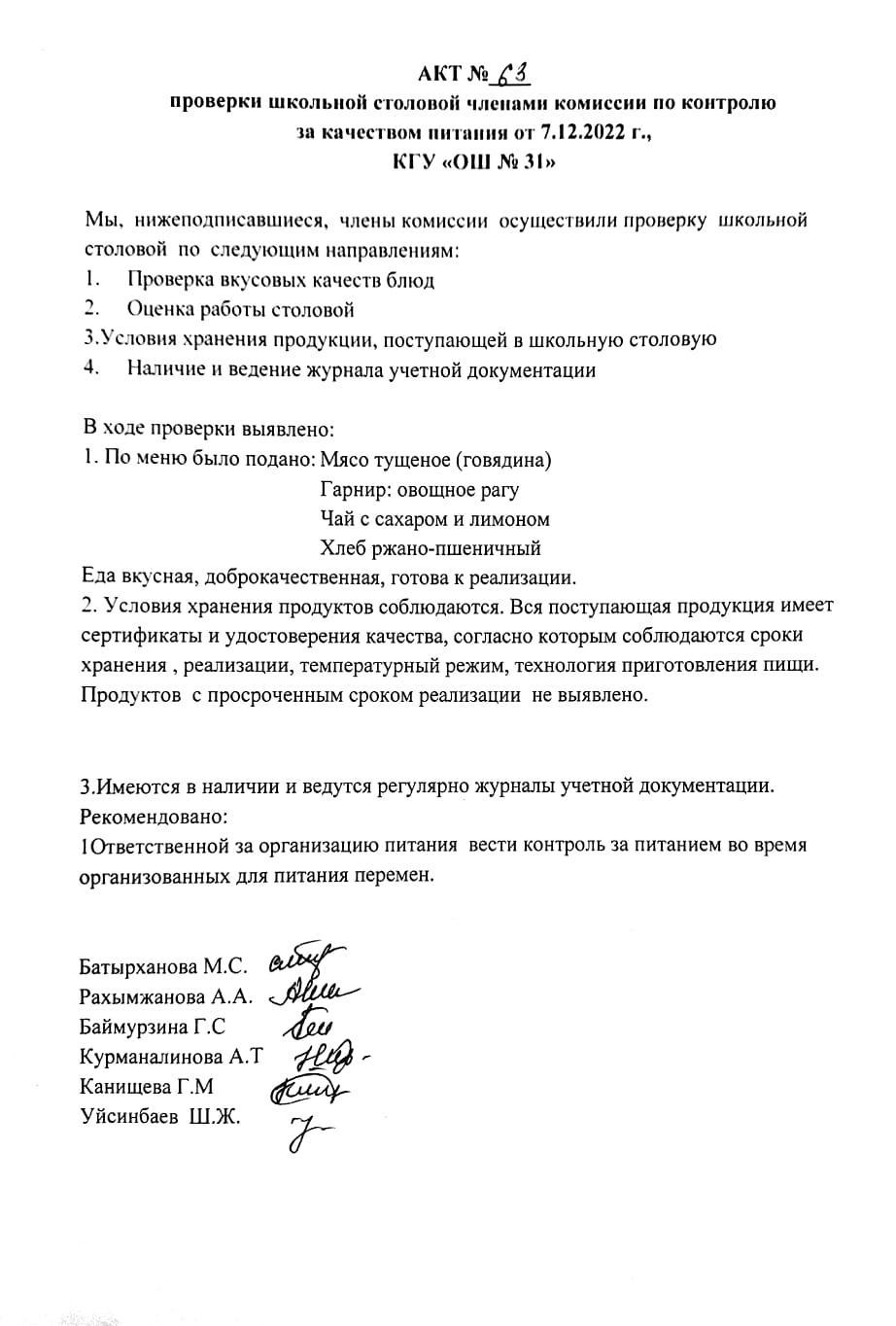 07 желтоқсан 2022 0 1 2 3 4 5 Бақылау комиссиясы мүшелерінің мектеп асханасын тексеру актісі. АКТ проверки школьной столовой членами комисии по контролю за качеством питания