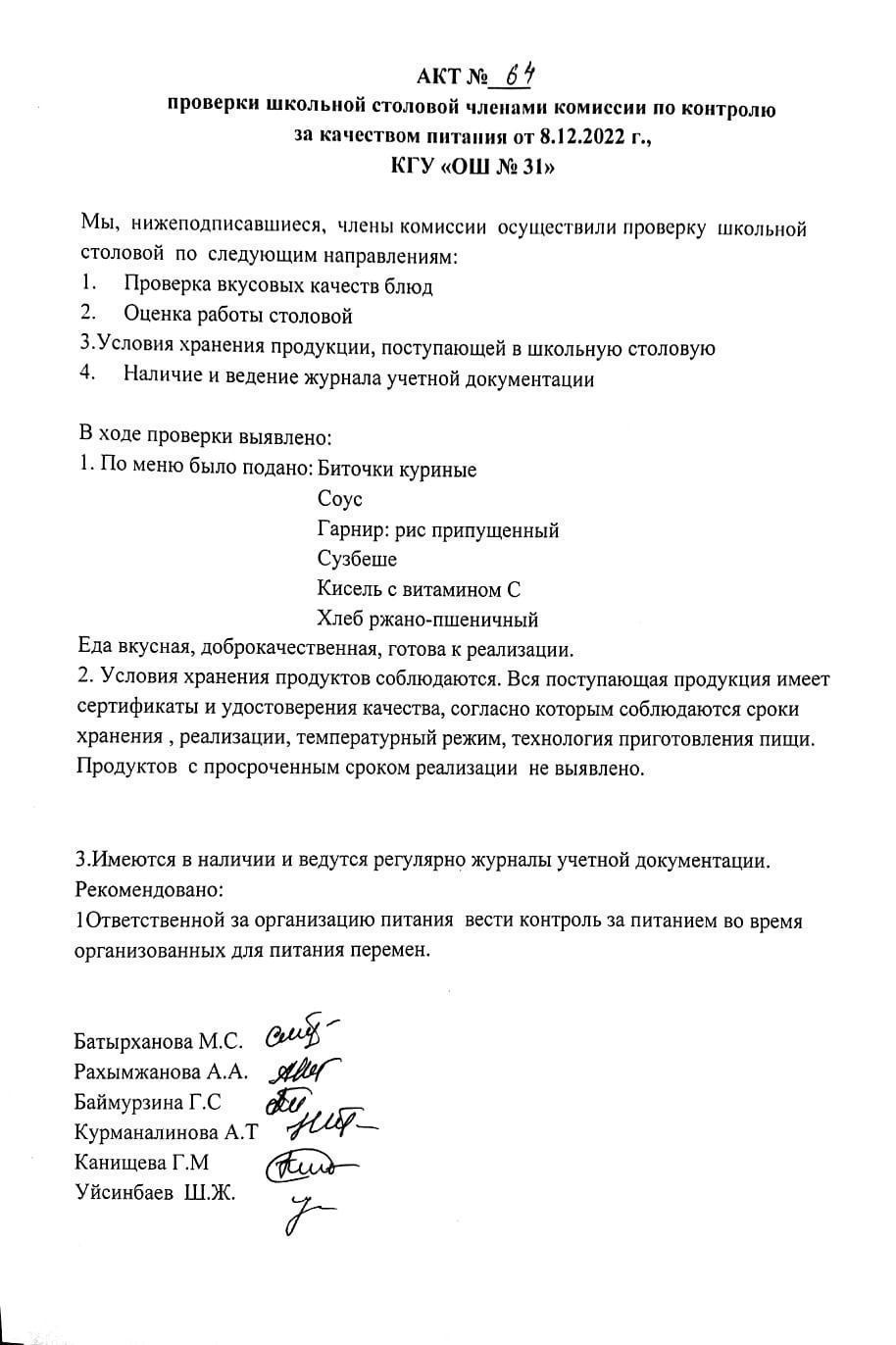 08 желтоқсан 2022 0 1 2 3 4 5 Бақылау комиссиясы мүшелерінің мектеп асханасын тексеру актісі. АКТ проверки школьной столовой членами комисии по контролю за качеством питания