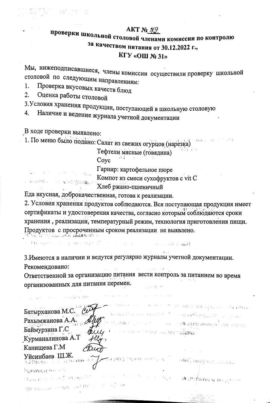 27 желтоқсан 2022 0 1 2 3 4 5 Бақылау комиссиясы мүшелерінің мектеп асханасын тексеру актісі. АКТ проверки школьной столовой членами комисии по контролю за качеством питания