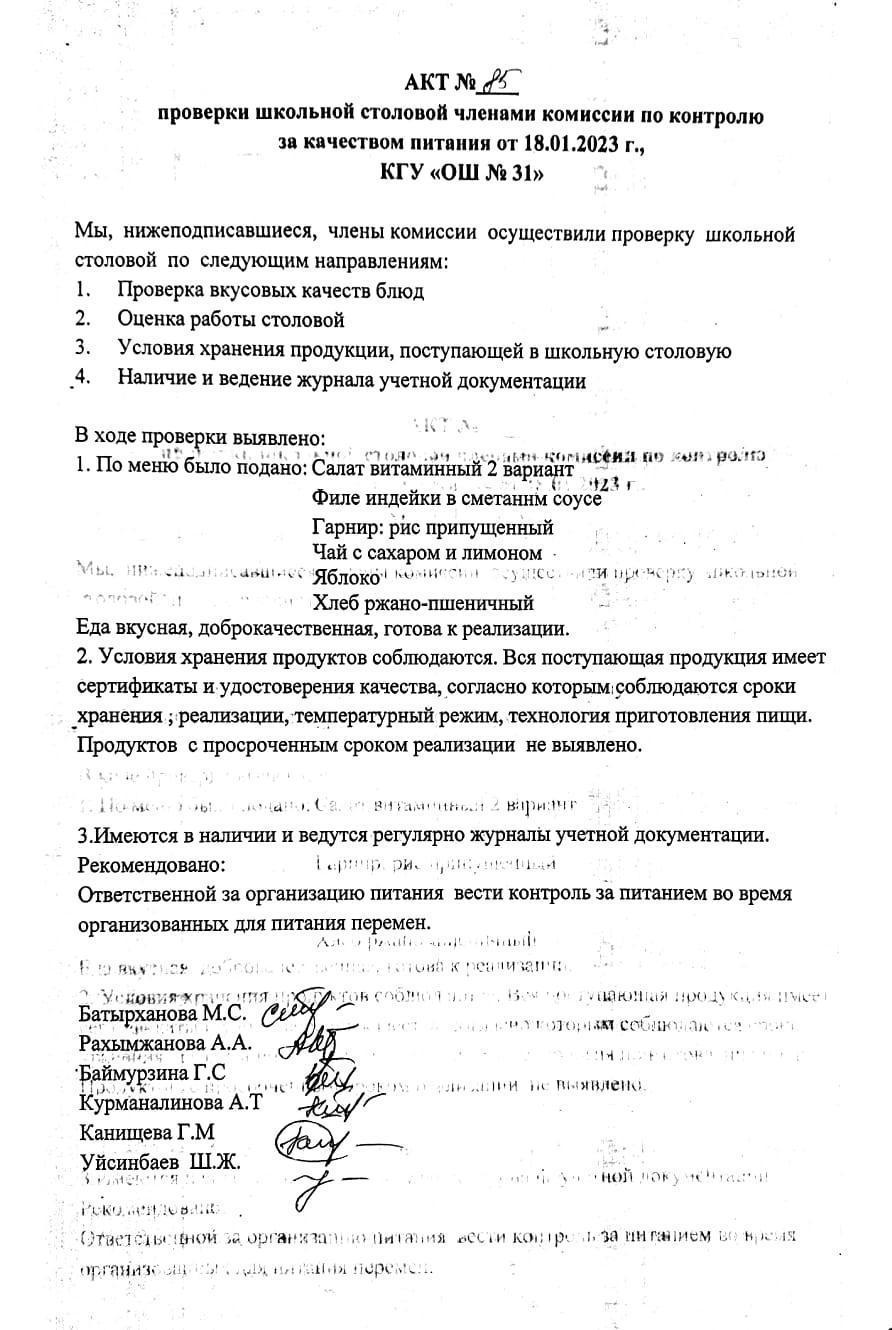 18 қаңтар 2023 0 1 2 3 4 5 Бақылау комиссиясы мүшелерінің мектеп асханасын тексеру актісі. АКТ проверки школьной столовой членами комисии по контролю за качеством питания