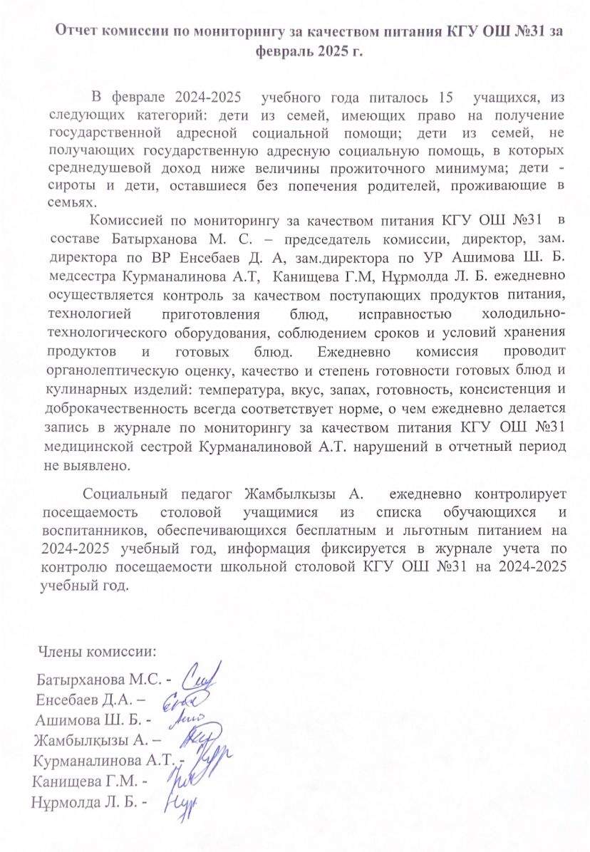 28 ақпан 2025 0 1 2 3 4 5 Оқушылардың тамақпен қамтамасыз етуілінің дұрыс ұйымдастырылуын бақылау актісі