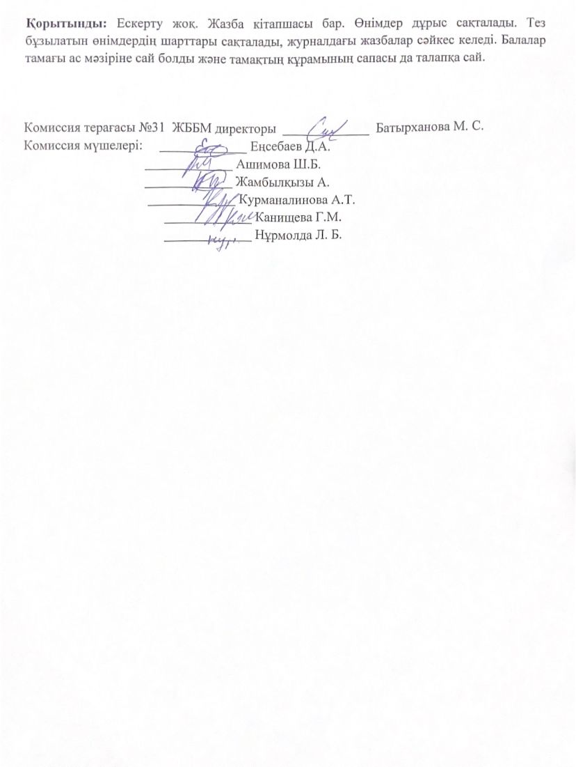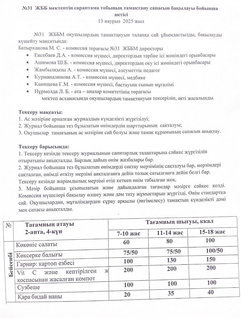20 наурыз 2025 0 1 2 3 4 5 2024 жылғы наруыз айының №31 ЖББ КММ тамақтану сапасын бақылау комиссиясының есебі. Отчет комисии по мониторингу за качеством питания
