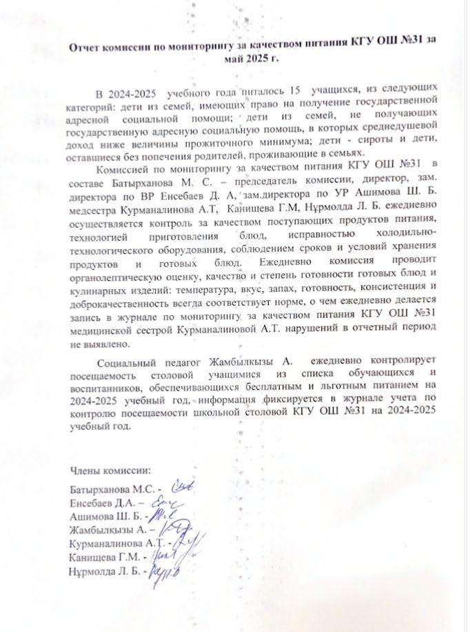 30 мамыр 2025 0 1 2 3 4 5 2024 жылғы мамыр айының №31 ЖББ КММ тамақтану сапасын бақылау комиссиясының есебі. Отчет комисии по мониторингу за качеством питания