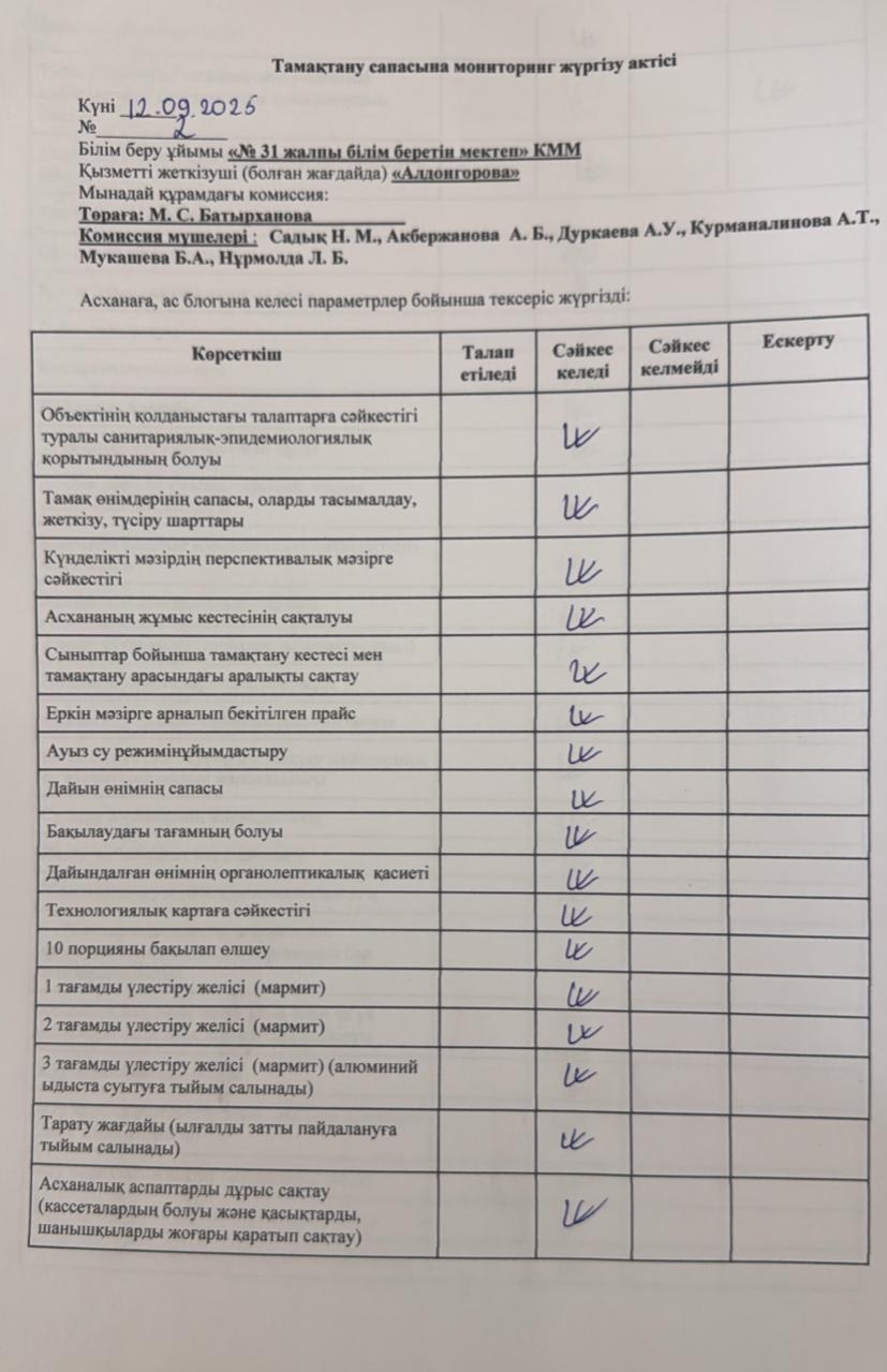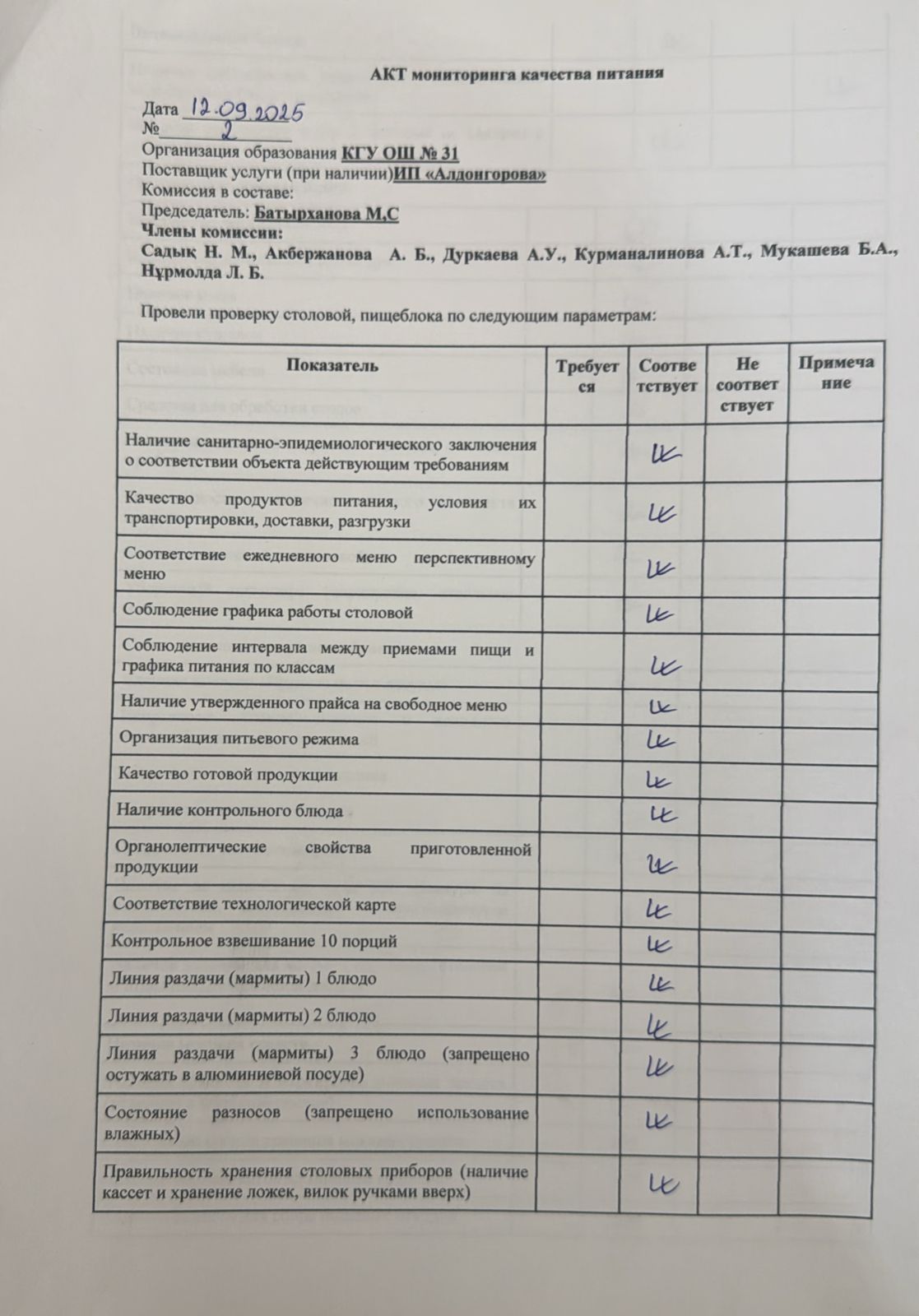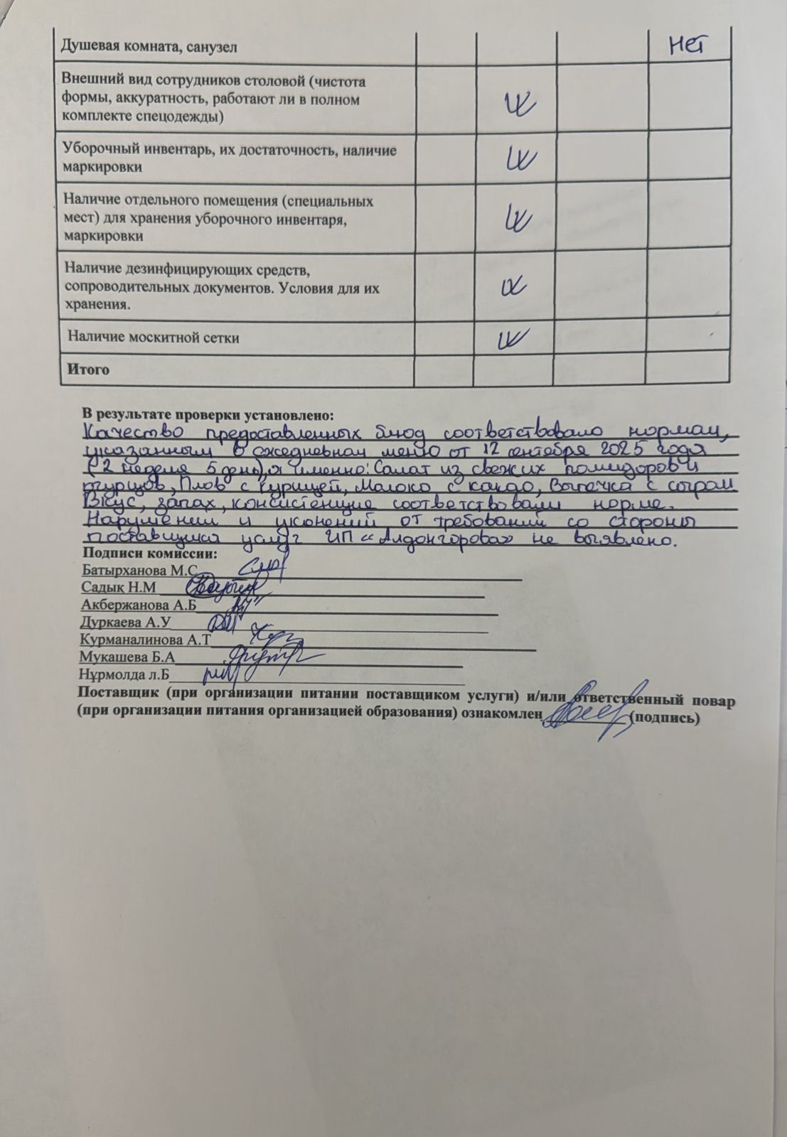 12 қыркүйек 2025 0 1 2 3 4 5 Тамақтану сапасына мониторинг жүргізу актісі .Акт мониторинга качества питания.12.09.2025