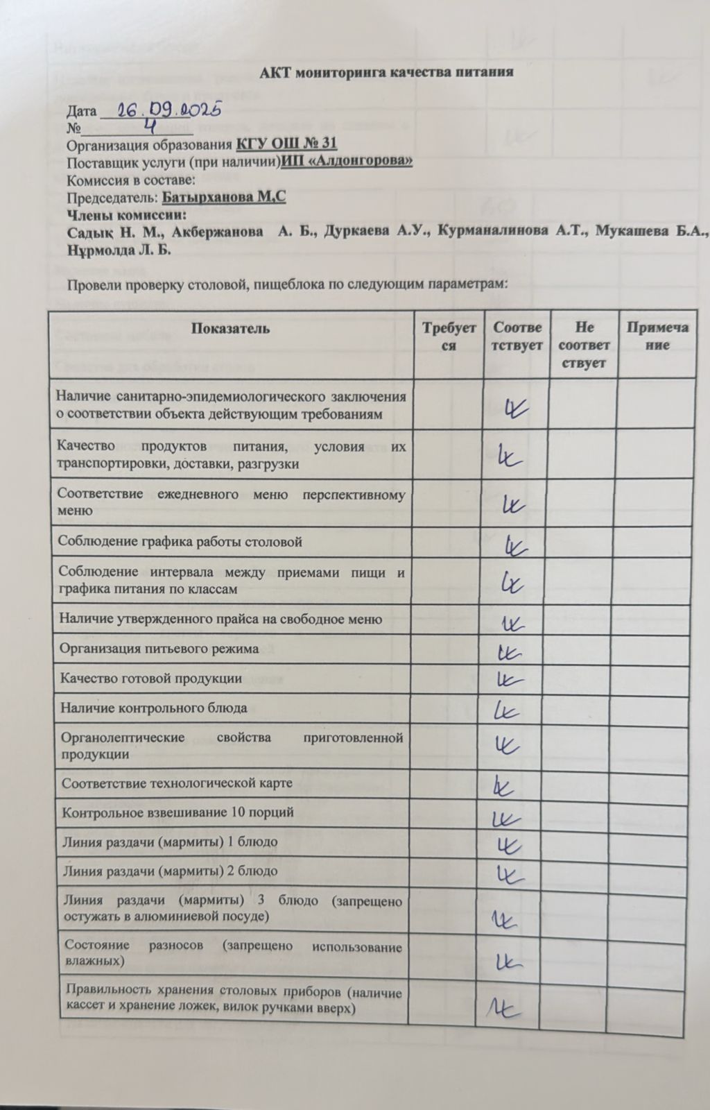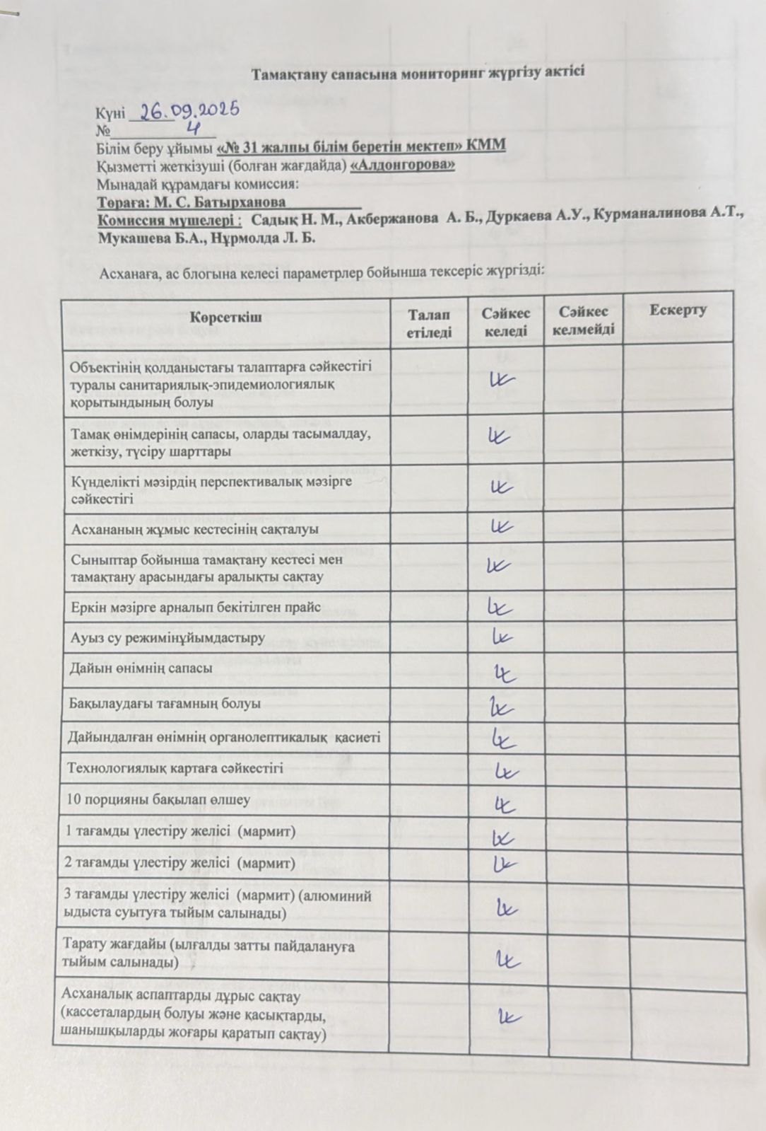 26 қыркүйек 2025 0 1 2 3 4 5 Тамақтану сапасына мониторинг жүргізу актісі .Акт мониторинга качества питания.26.09.2025