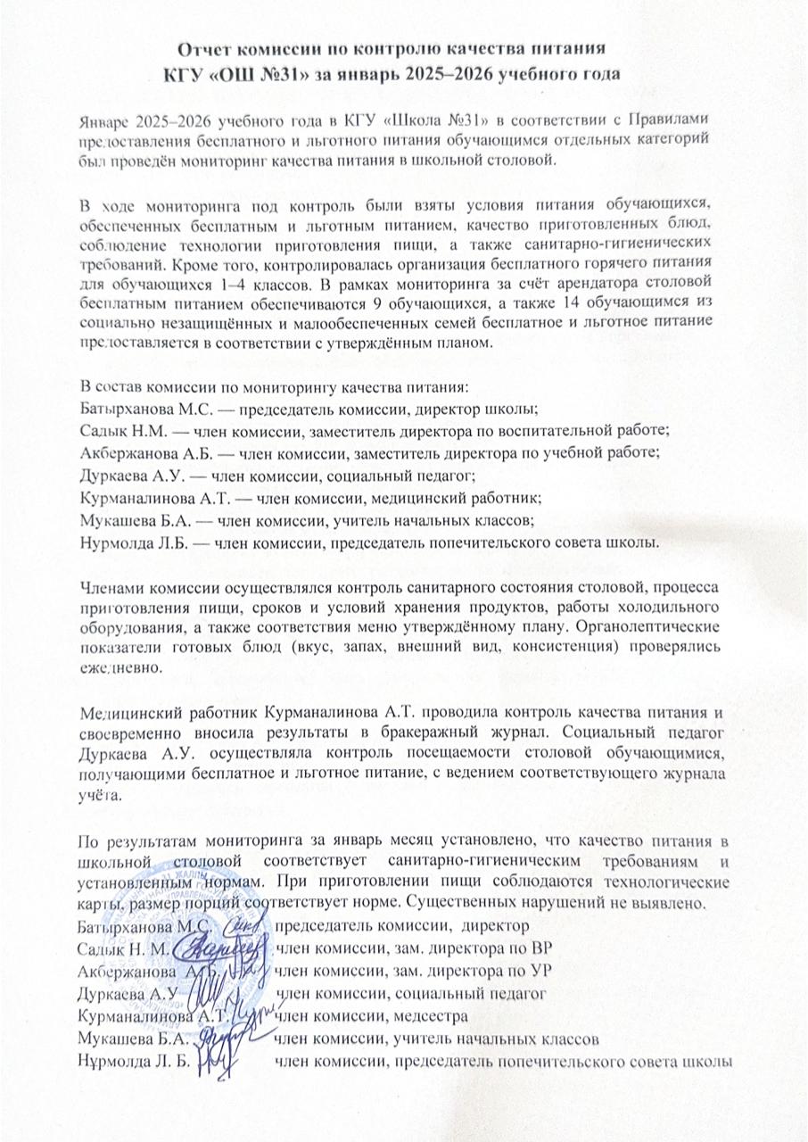 28 қаңтар 2026 0 1 2 3 4 5 2026 жылғы қаңтар айының №31 ЖББМ КММ тамақтану сапасын бақылау комиссиясының есебі.
