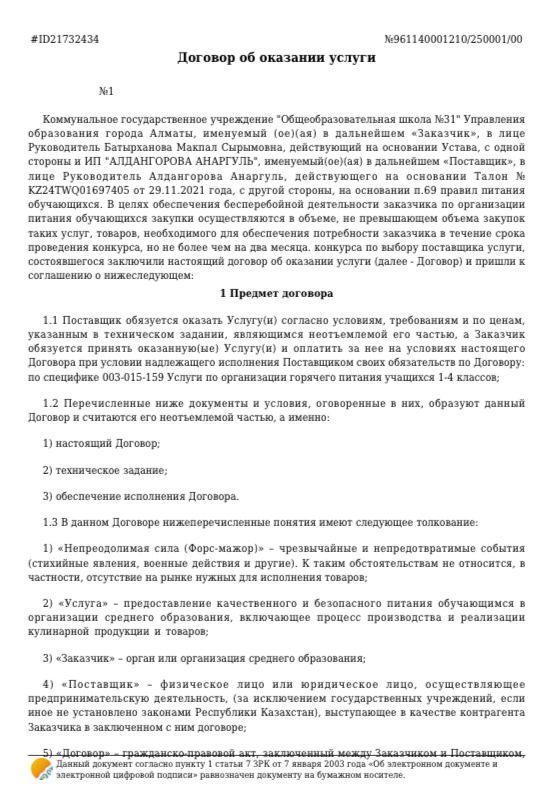 2025 жылға арналған тамақтану шарты. Договор по питанию на 2025г.